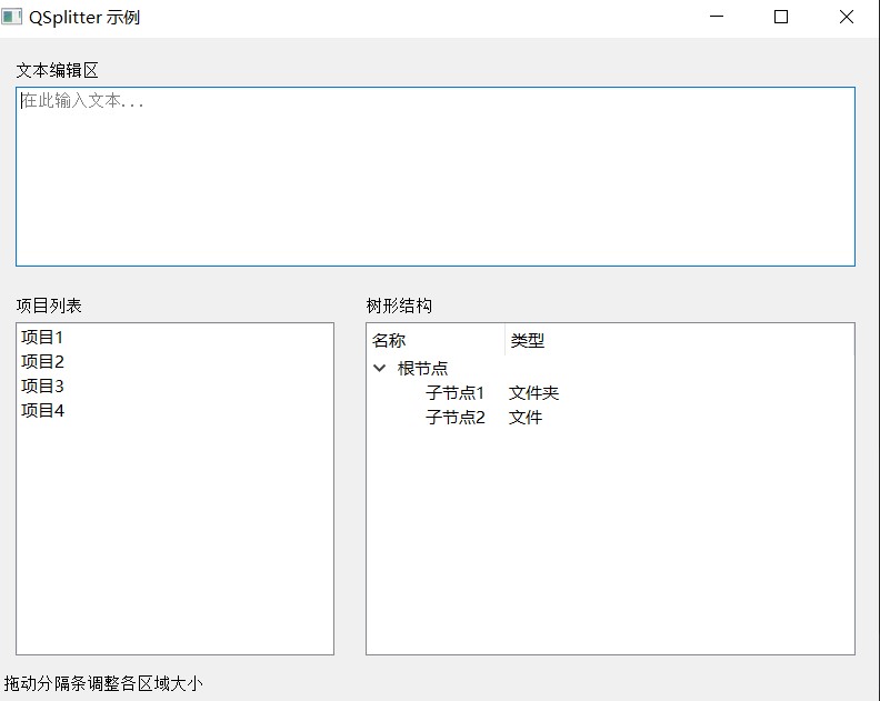 - QSplitter:拆分器容器,可以将容器水平或垂直拆分为两个或更多子容器,让用户可以自由地调整它们的大小